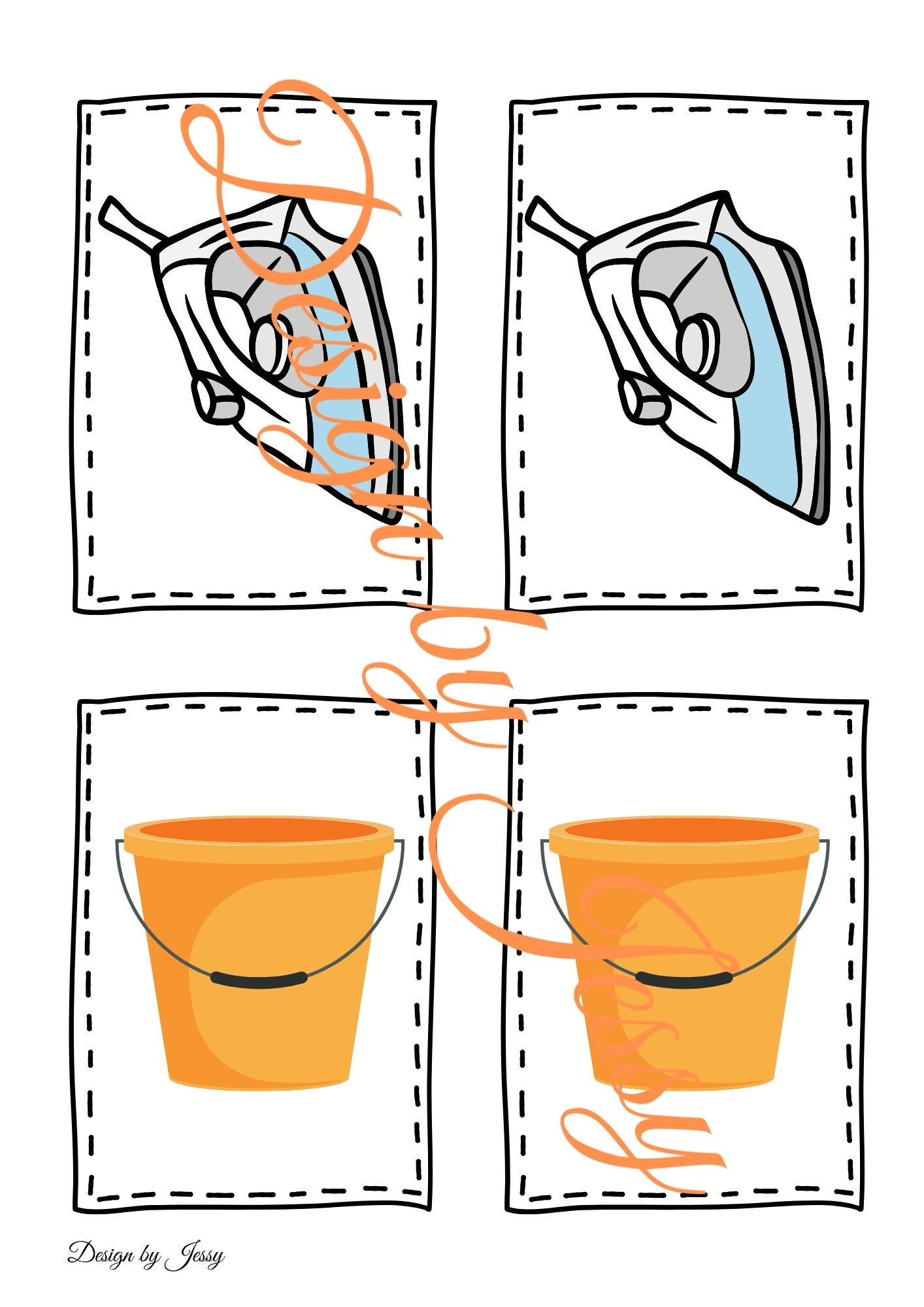 In der Mappe befinden sich Bildkarten mit unterschiedlichen Putzutensilien, zum Beispiel Besen, Staubsauger, Lappen oder Eimer. Die Kinder betrachten die Bildkarten, benennen die Gegenstände und sprechen darüber, wofür sie benutzt werden. Dabei werden einfache Sätze geübt, wie zum Beispiel: „Das ist ein Besen“ oder „Mit dem Lappen wische ich“.