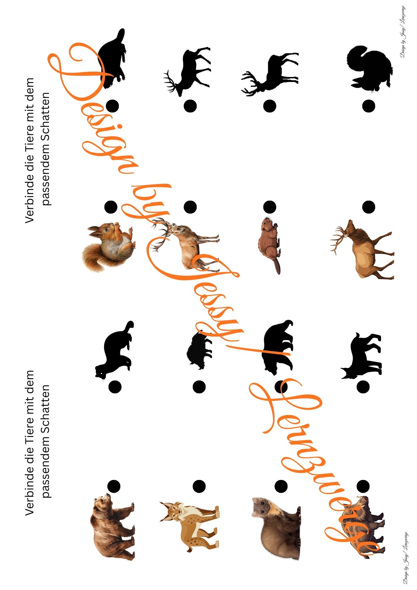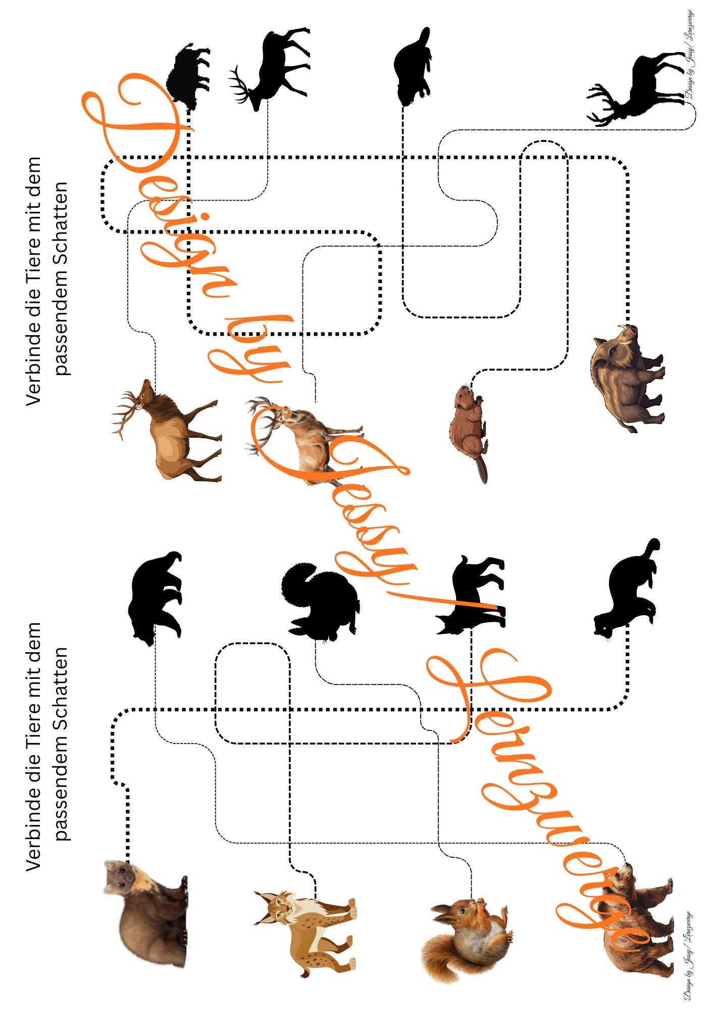 Ergänzend enthält die Mappe verschiedene Rätsel und Lernaufgaben, wie das Verbinden von Tieren mit ihren Schattenbildern oder das Zuordnen der Tiere zu ihrem passenden Futter. Diese Aufgaben fördern das genaue Hinschauen, logisches Denken und das Erkennen von Zusammenhängen.