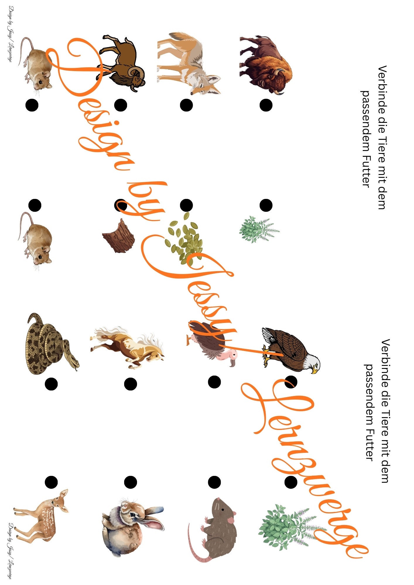 Ergänzend enthält die Mappe verschiedene Rätsel und Lernaufgaben, wie das Verbinden von Tieren mit ihren Schattenbildern oder das Zuordnen der Tiere zu ihrem passenden Futter. Diese Aufgaben fördern das genaue Hinschauen, logisches Denken und das Erkennen von Zusammenhängen.