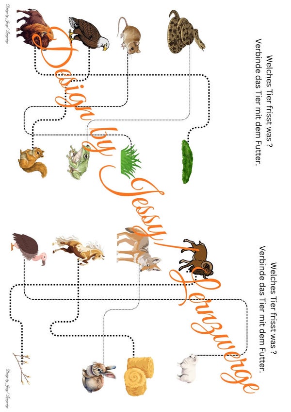 Zu jedem Tier gibt es außerdem einen Steckbrief mit altersgerechten Informationen, zum Beispiel zur Größe des Tieres und zu seiner Nahrung. Dabei schneiden die Kinder die abgebildeten Futtermittel aus und kleben sie dem passenden Tier zu. Diese Aufgabe fördert zusätzlich die Feinmotorik, die Hand-Auge-Koordination und das selbstständige Arbeiten.