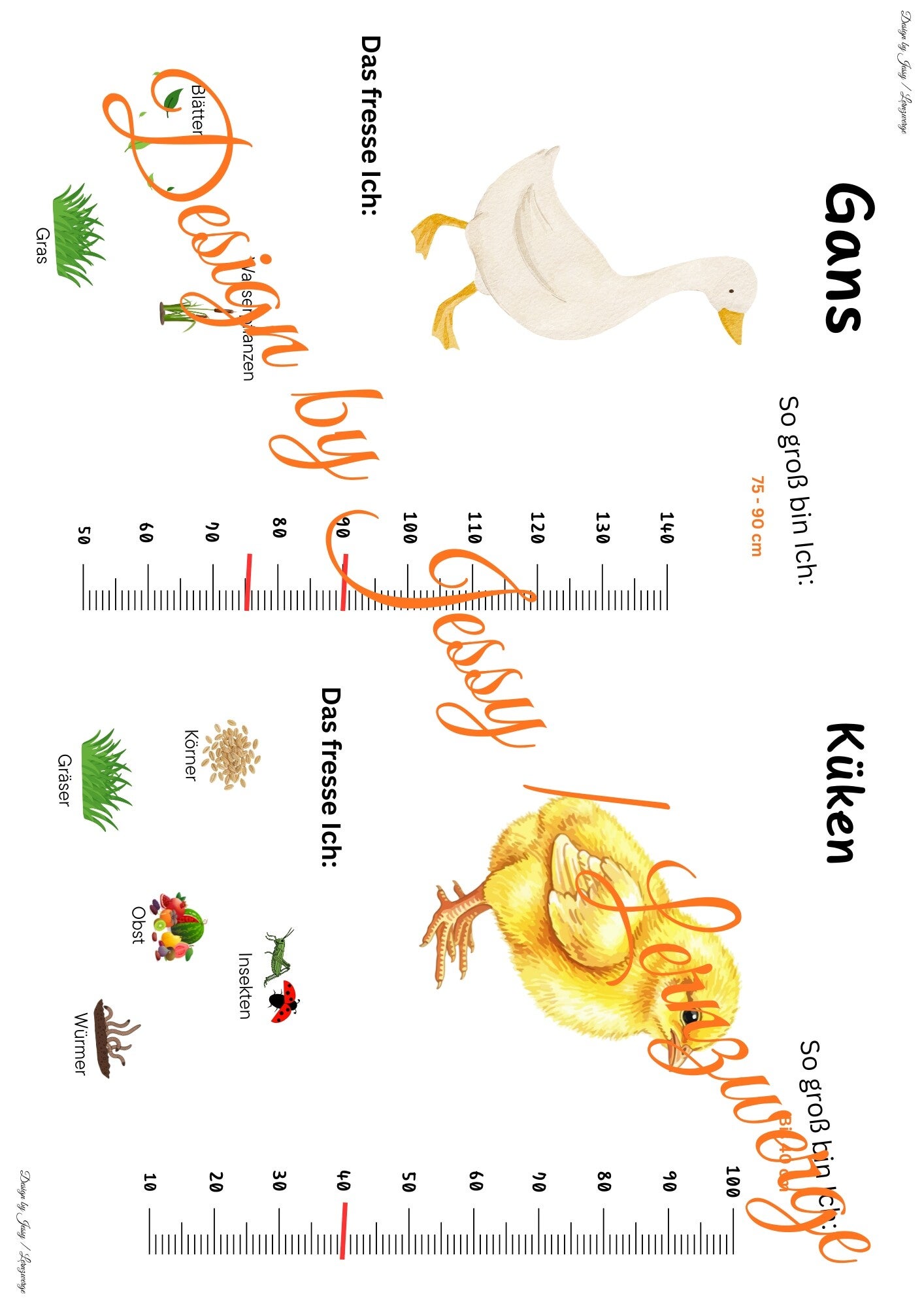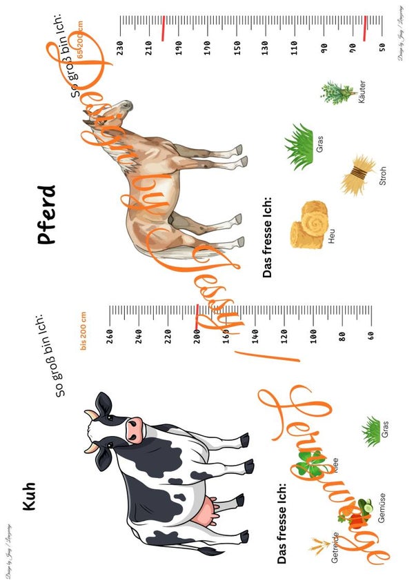 Jeder Steckbrief enthält die Körpergröße des jeweiligen Tiers, was einen direkten Größenvergleich zwischen den Arten ermöglicht. Ergänzend werden die Informationen durch anschauliche Abbildungen dagestellt. Welches Tier nimmt welche Nahrung zu sich. So entsteht ein kindgerechter, aber sachlich fundierter Einstieg in die Lebwnsweise und Merkmale der Bauernhoftiere