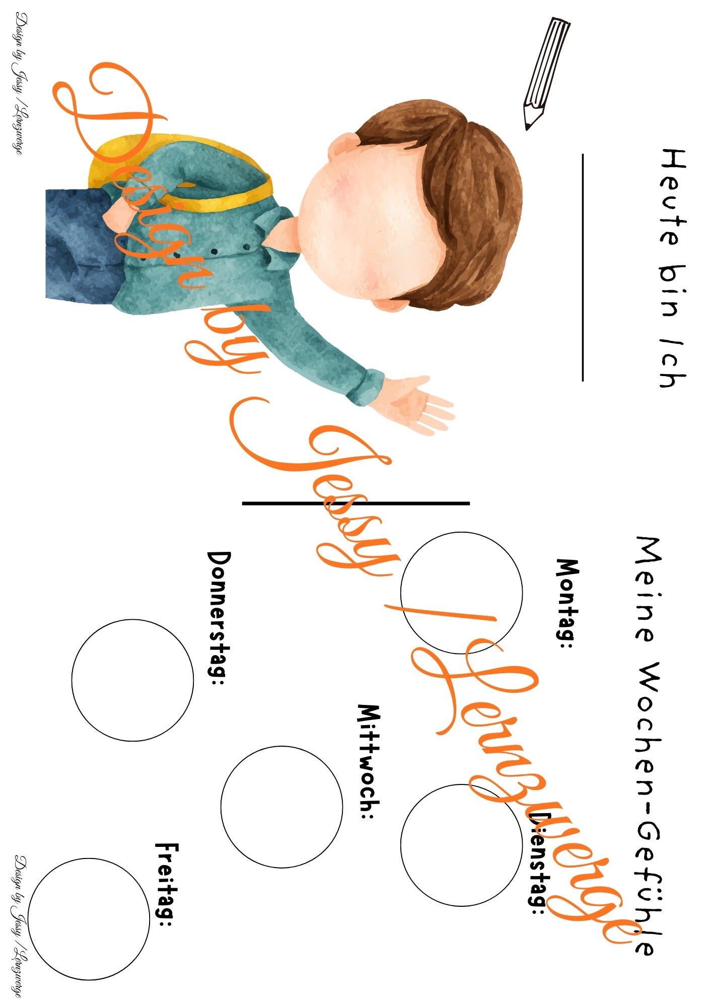 Außerdem erzählen sie von ihren Freunden und Ihrer Familie- wer gehört dazu und warum sind sie so wichtig?Zusätzlich gibt es zwei Seiten mit jeweil einem eigenen Handabdruck und Fußabdruck. Die eigenen Gefühle erkennen und bennenen können. Dies wird durch einfaches malen gezielt geübt. Auch findet sich in der Mappe eine Wochenübersicht der Gefühle. Für jeden Tag kann der Junge ein Geischt in den Kreis malen wie es ihr heute geht. Abgerundet wird das ganze durch eine Geschichte über Gefühle und zwei Jungen die zum ausmalen sind.
