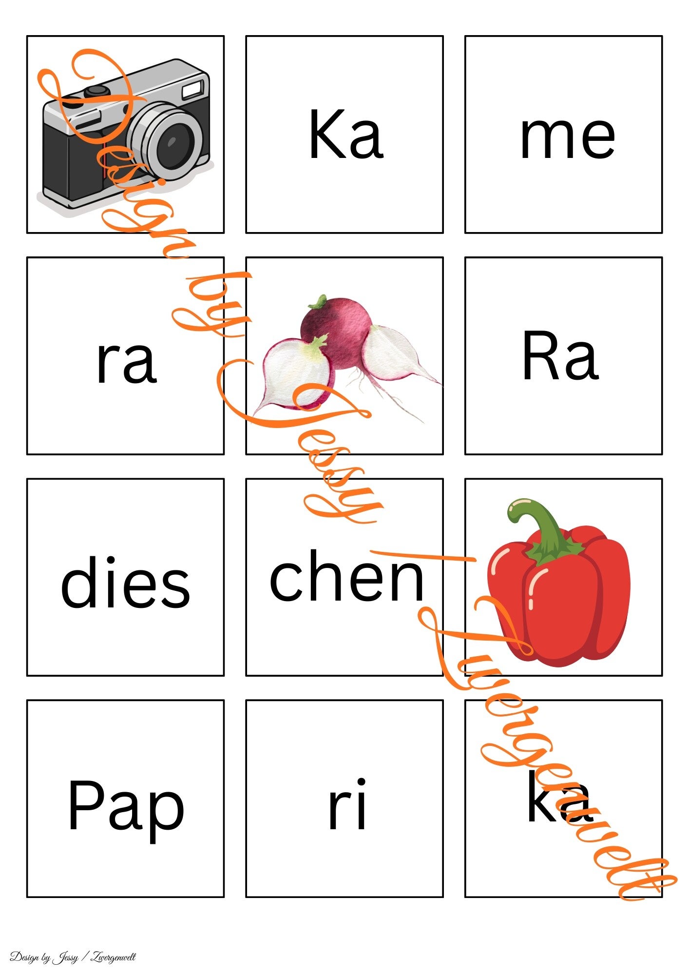 Dieses pädagogische Set enthält farbenfrohe Karten mit Illustrationen und drei-silbigen Wörtern (z. B. Elefant (E le fant), Melone (Me lo ne), Banane (Ba na ne), Tomate (To ma te), Kamera (Ka me ra), Paprika (Pap ri ka), Telefon (Te le fon)). Zum Ausdrucken und Basteln von Lege-Karten – ideal für Kita oder Zuhause.