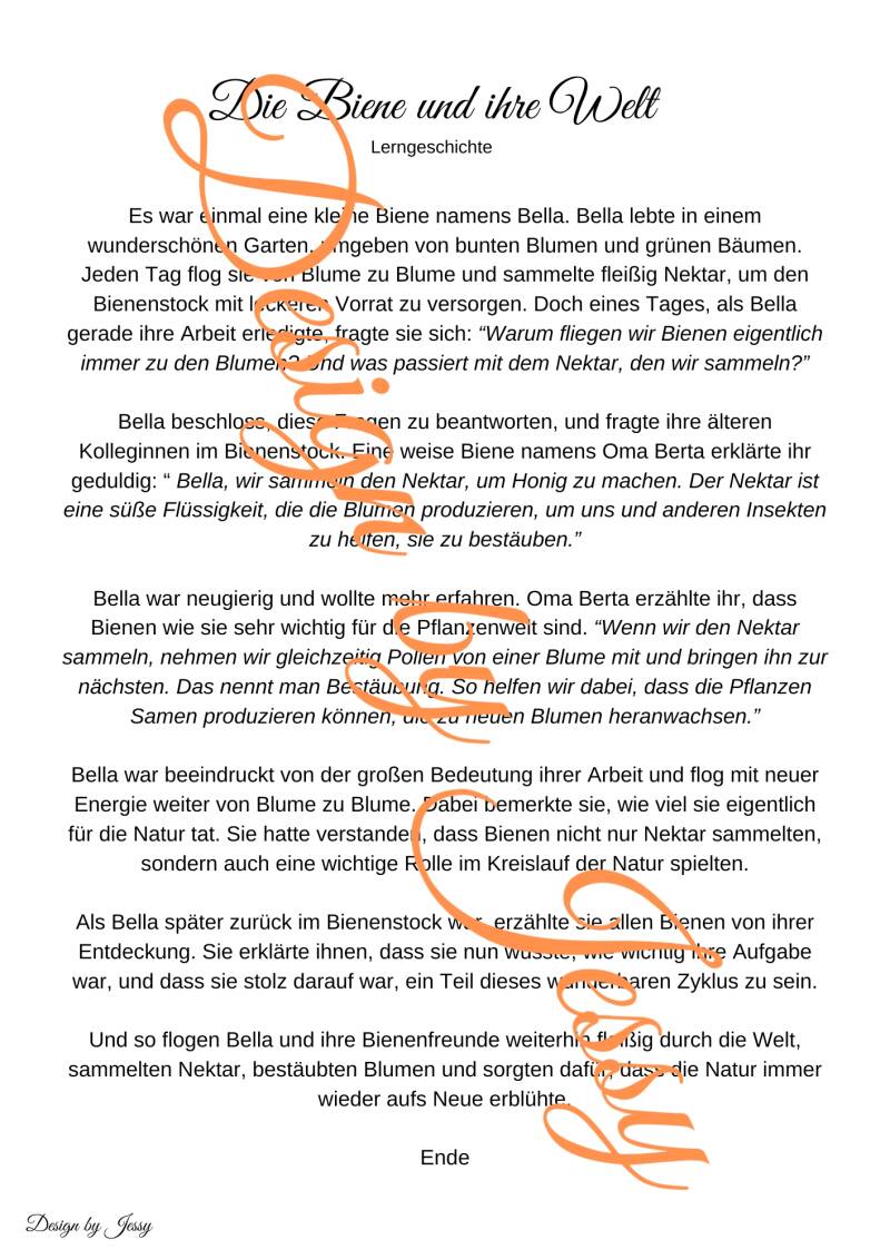 Die Lerngeschichte „Die Biene und ihre Welt“ nimmt Kinder mit in die faszinierende Welt der kleinen Biene Bella. Gemeinsam mit ihr entdecken sie, warum Bienen von Blume zu Blume fliegen, wie Honig entsteht und welche wichtige Rolle Bienen im Kreislauf der Natur spielen.