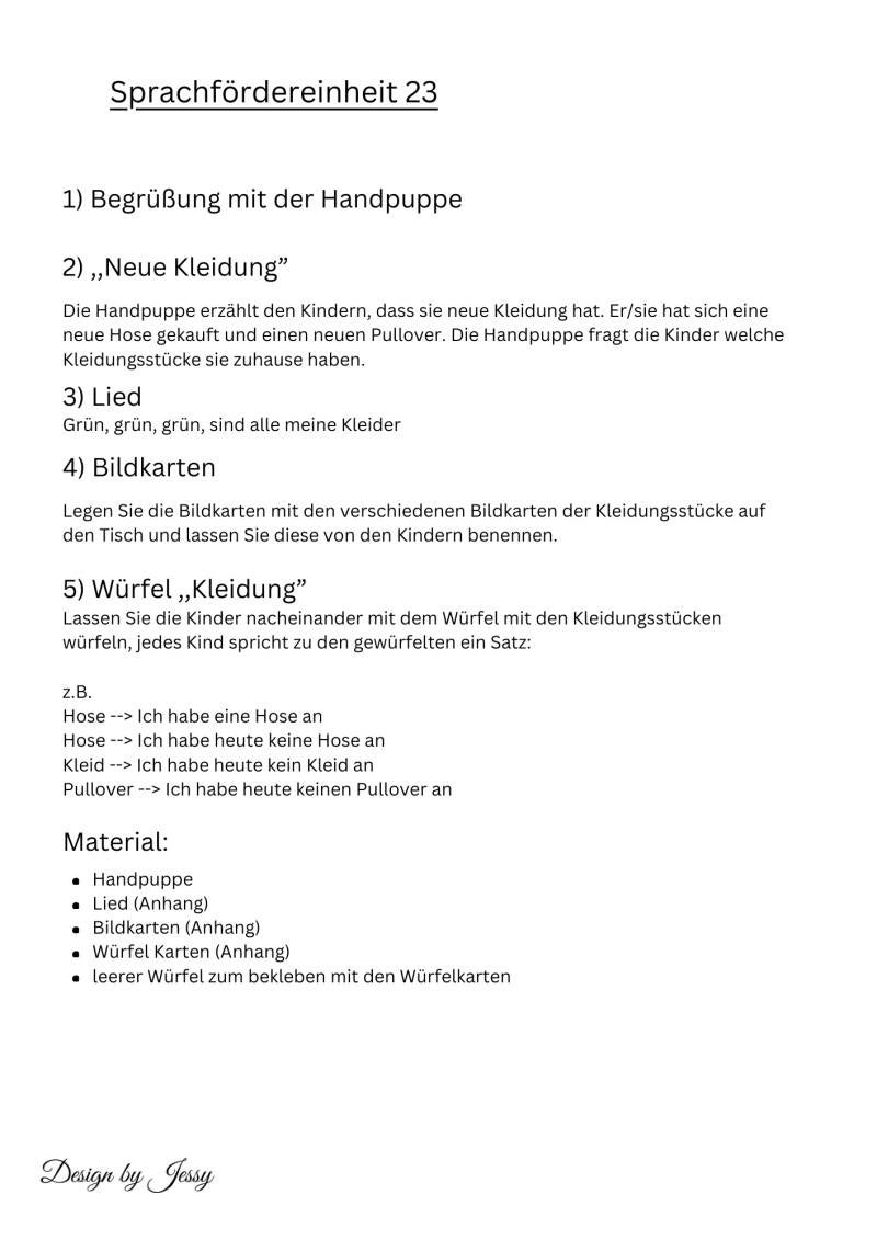 Zusätzlich enthält die Mappe ein passendes Lied zum Thema Kleidungsstücke, das die Sprachförderung durch Rhythmus und Wiederholung unterstützt. Der Fokus liegt auf der Sprachförderung: Die Kinder erweitern ihren Wortschatz, üben das Benennen von Kleidungsstücken und erleben Sprache spielerisch durch Singen und gemeinsames Mitmachen.