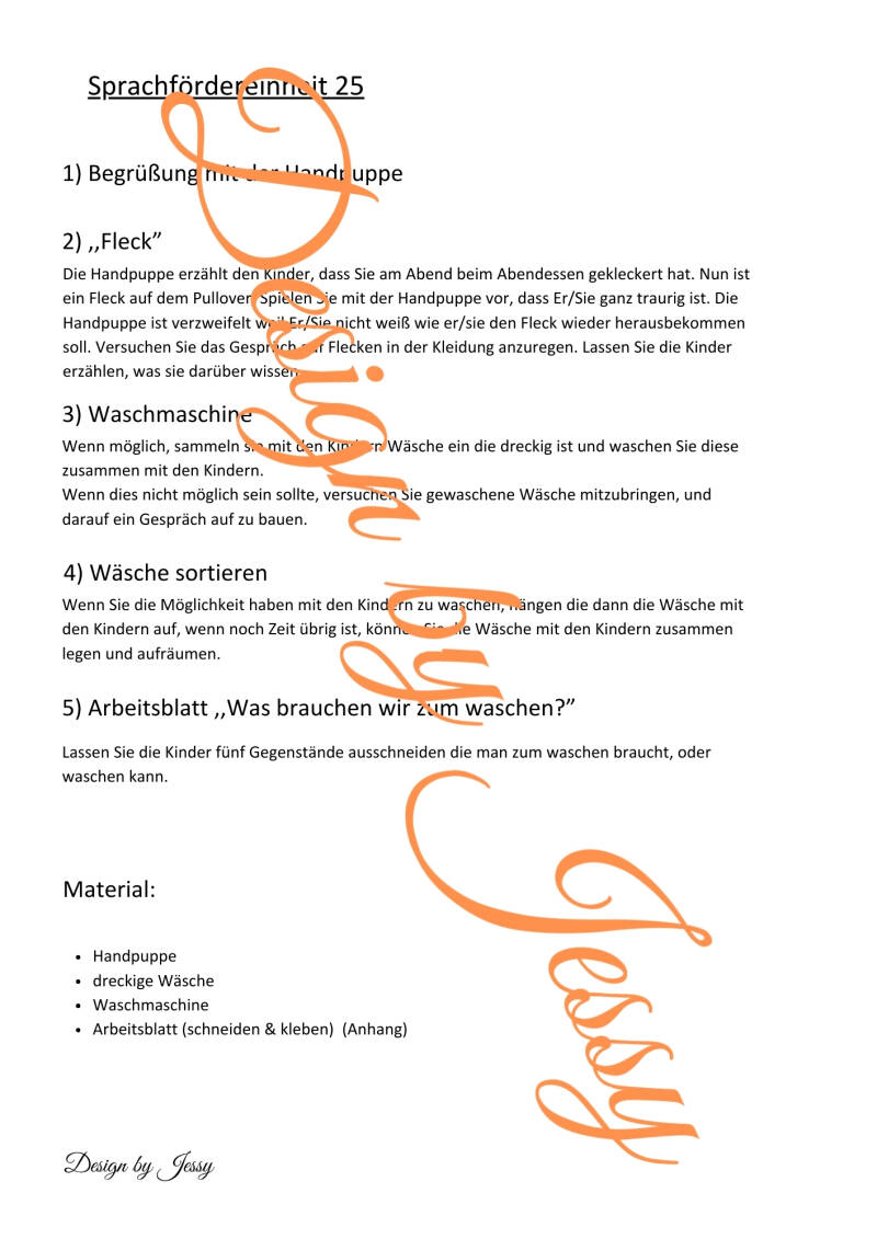 In dieser Einheit lernen die Kinder, wie man Kleidung richtig pflegt. In der Mappe befindet sich ein Arbeitsblatt, auf dem verschiedene Gegenstände abgebildet sind. Die Kinder schneiden diese aus und kleben nur die Gegenstände auf, die gut für unsere Kleidung sind, z. B. die Waschmaschine für saubere Wäsche. Dinge, die der Kleidung schaden (z. B. ein Stein), werden nicht aufgeklebt.