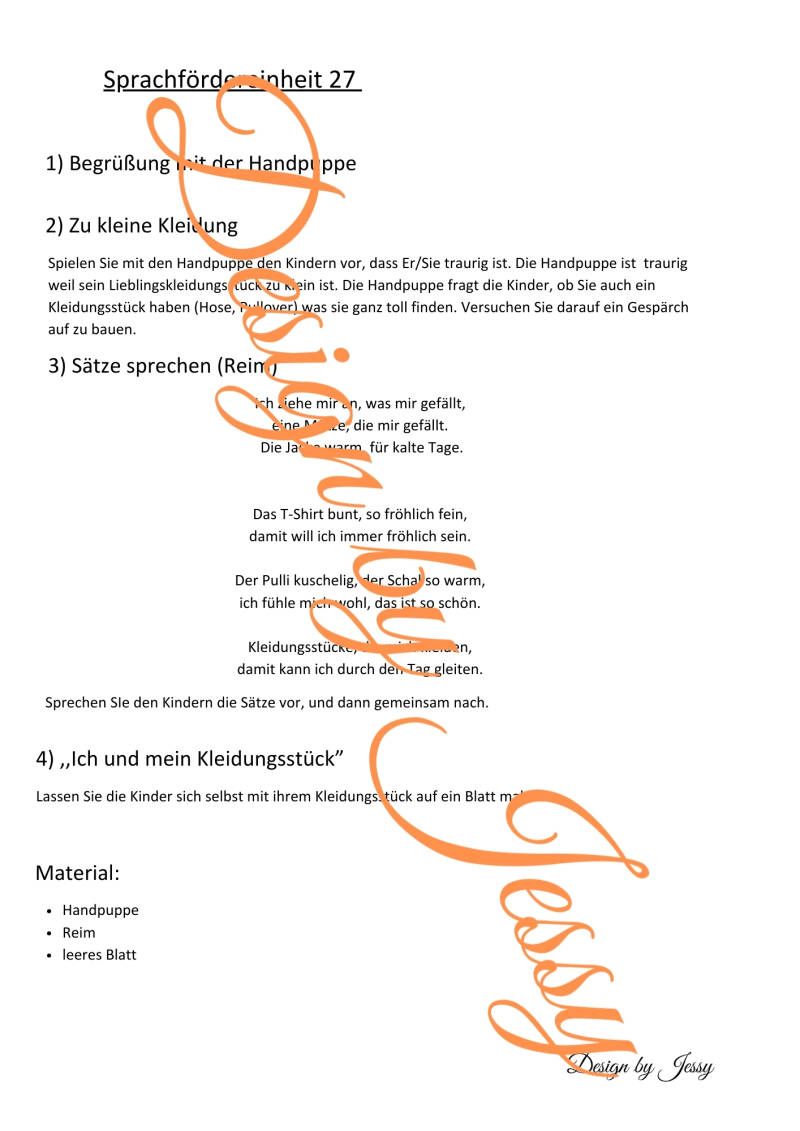 In dieser Sprachfördereinheit dreht sich alles um die Lieblingskleidung der Kinder. Die Kinder sprechen über Kleidungsstücke, die sie gerne tragen, zum Beispiel T-Shirts, Hosen, Kleider, Pullover oder Jacken. Dabei lernen sie neue Wörter und wiederholen bekannte Begriffe rund um das Thema Kleidung.
