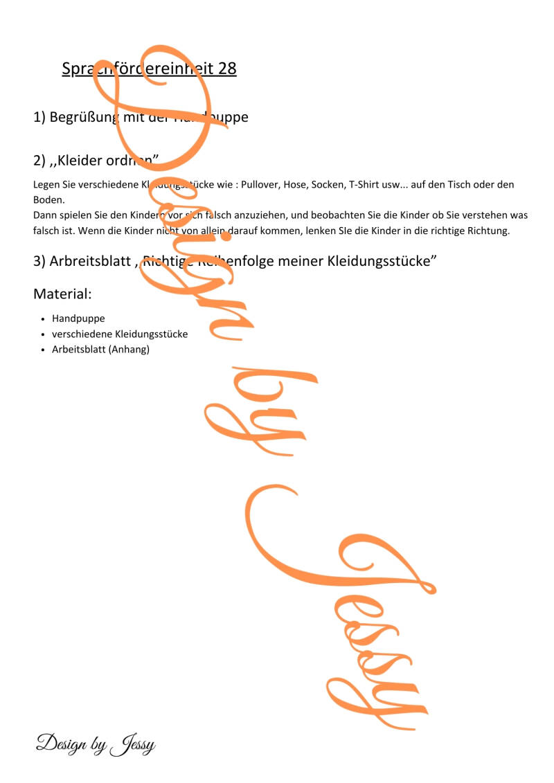 In dieser Sprachfördereinheit beschäftigen sich die Kinder mit dem Thema „So ziehe ich mich an“. Ziel ist es, den Wortschatz rund um Kleidungsstücke sowie Handlungsabfolgen sprachlich zu fördern.