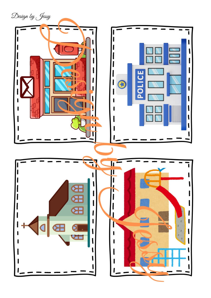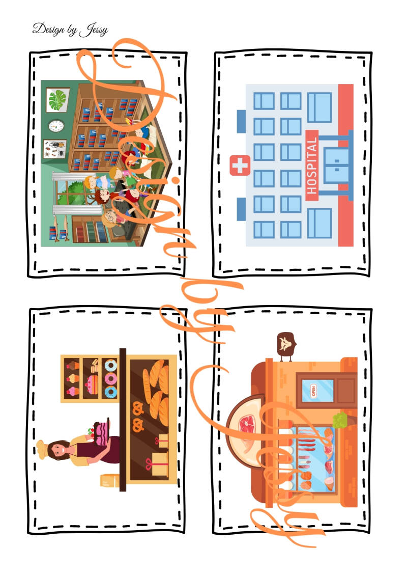 In der Mappe befinden sich Bildkarten mit unterschiedlichen Gebäuden, zum Beispiel Krankenhaus, Polizei, Feuerwehr oder Schule. Die Kinder betrachten die Bildkarten, benennen die Gebäude und sprechen darüber, was man dort macht. Dabei werden einfache Sätze geübt, wie zum Beispiel: „Das ist das Krankenhaus“ oder „Bei der Feuerwehr löschen sie Feuer“.