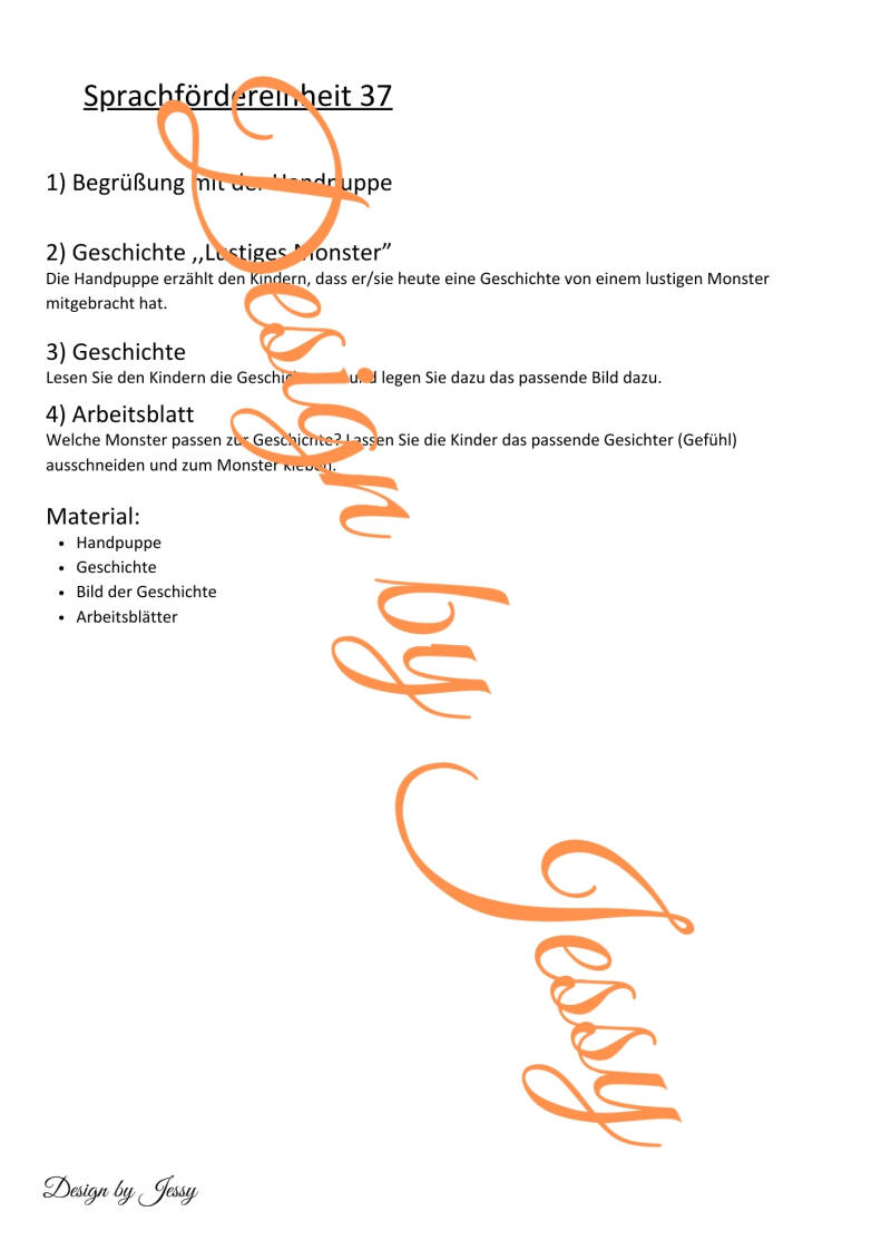 In der Mappe befindet sich eine Geschichte, die verschiedene Gefühle thematisiert. Die Kinder hören die Geschichte und sprechen über die dargestellten Emotionen. Sie benennen, wie sich die Figuren fühlen, zum Beispiel: „Das Monster ist traurig“, „Das Monster ist fröhlich“ oder „Das Monster ist wütend“.