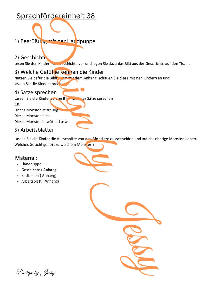 In der Mappe befindet sich eine Geschichte, die verschiedene Gefühle thematisiert. Die Kinder hören die Geschichte, benennen die Gefühle der Figuren und sprechen darüber, wie sich die Monster fühlen, zum Beispiel: „Das Monster ist glücklich“, „Das Monster ist traurig“ oder „Das Monster ist überrascht“.