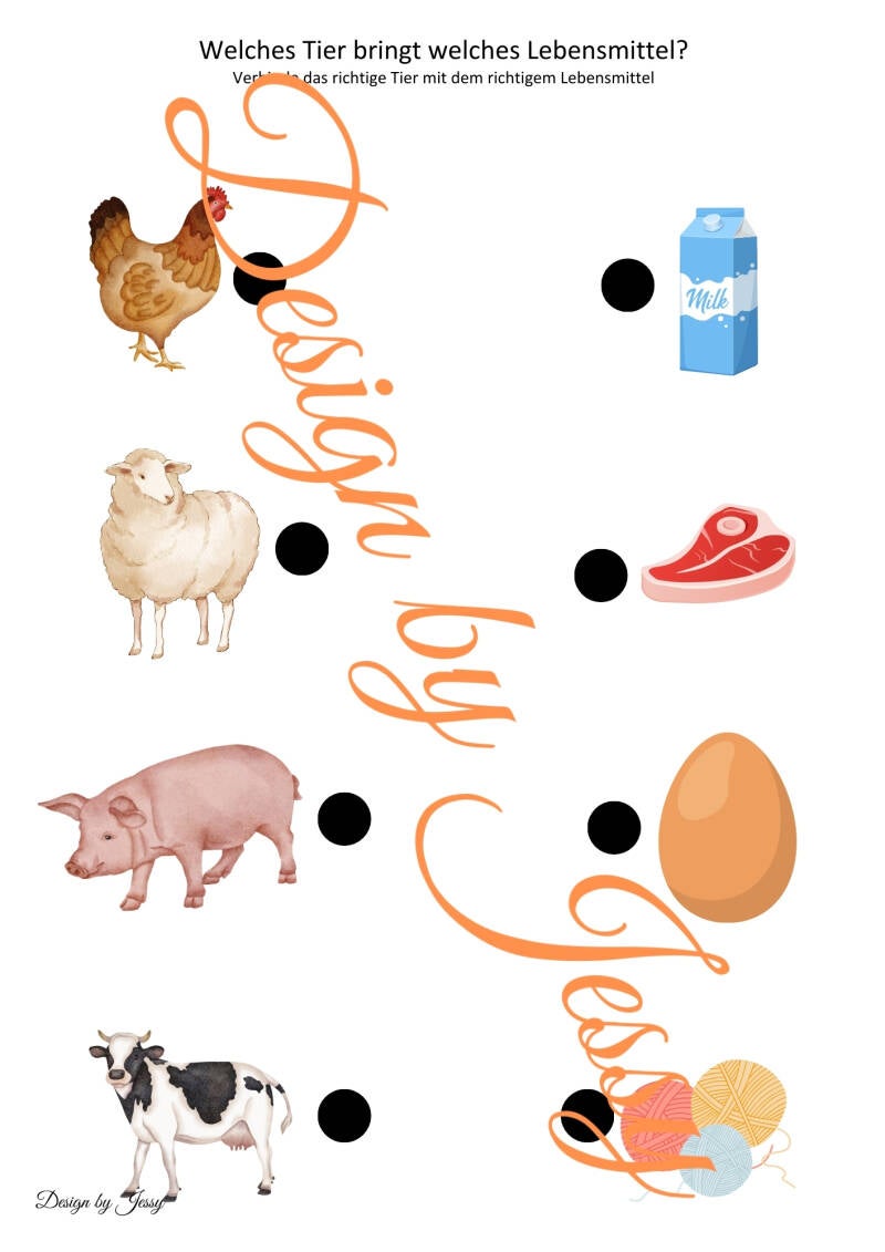 Zusätzlich enthält die Mappe ein Arbeitsblatt, auf dem die Kinder die einzelnen Tiere mit den passenden Lebensmitteln verbinden sollen, die sie produzieren. Dabei werden die Tiere und die Lebensmittel sprachlich benannt und einfache Sätze gebildet, zum Beispiel: „Die Kuh gibt Milch“, „Das Huhn legt Eier“ oder „Das Schaf gibt Wolle“.