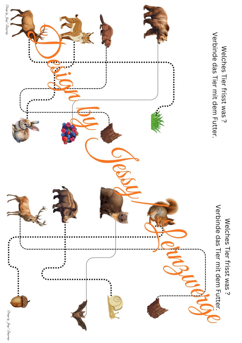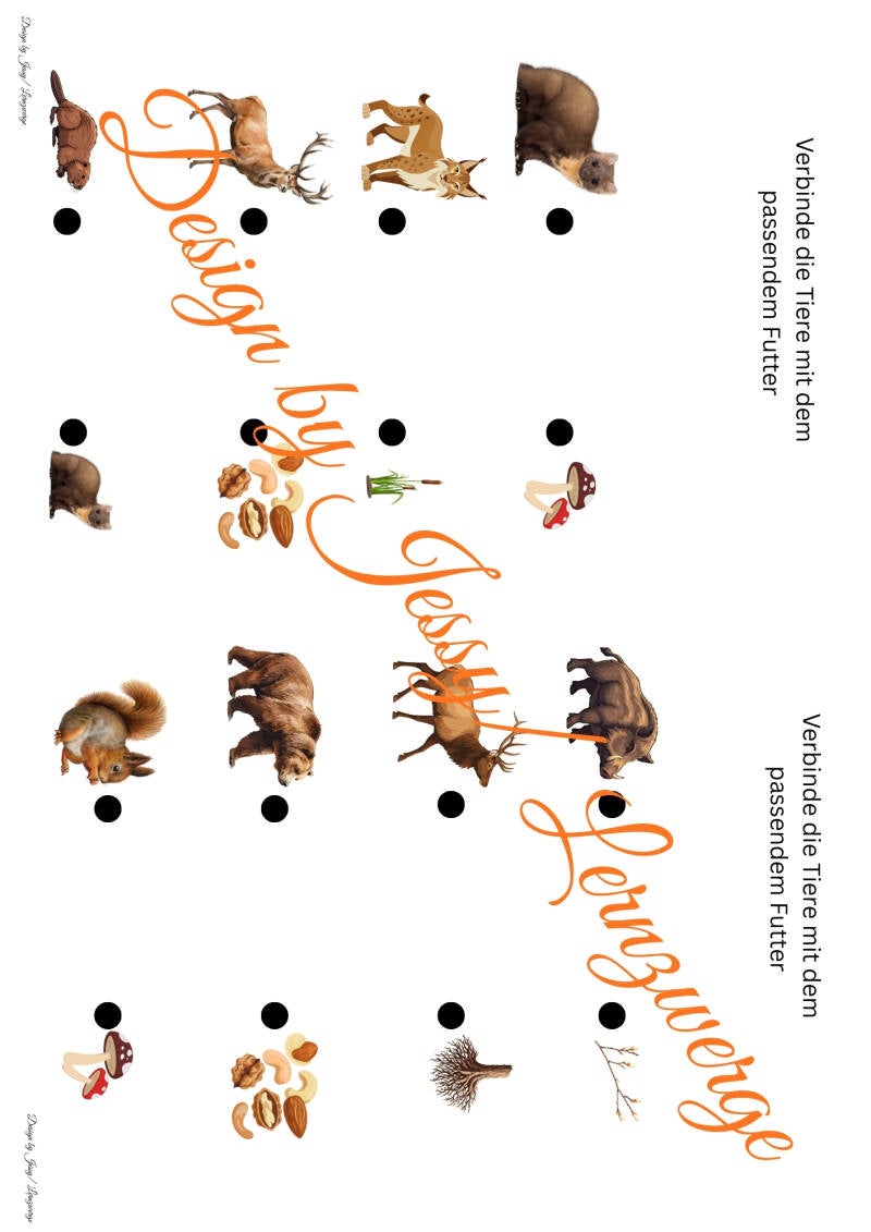 Ergänzend enthält die Mappe verschiedene Rätsel und Lernaufgaben, wie das Verbinden von Tieren mit ihren Schattenbildern oder das Zuordnen der Tiere zu ihrem passenden Futter. Diese Aufgaben fördern das genaue Hinschauen, logisches Denken und das Erkennen von Zusammenhängen.