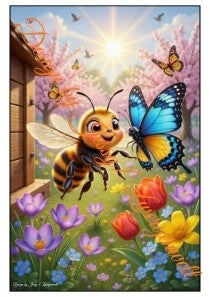 Die kleine Biene Berta erwacht nach dem Winter im Bienenstock und startet ihren ersten Frühlingsflug. Sie sammelt Nektar, trifft den Schmetterling Lina und erkundet zusammen mit ihr den blühenden Garten. Bei Regen schützen sie sich unter einem Blatt, bestaunen einen Regenbogen und fliegen am Abend glücklich zurück – ein zauberhaftes Abenteuer voller Blumen, Sonne und neuer Freundschaft.