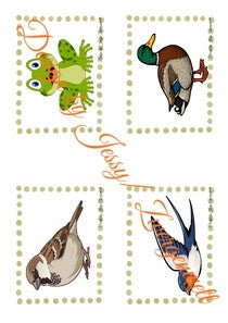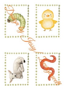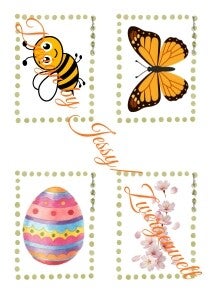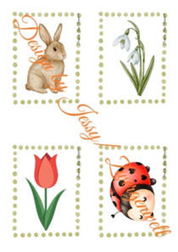 Enthalten sind die schönsten Motive: Marienkäfer, Schmetterlinge, Bienen, Hasen, Frösche, Enten, Küken, Spatzen, Schwalben, Tulpen, Narzissen, Schneeglöckchen, Krokusse, Gänseblümchen, ein Osterei und mehr.