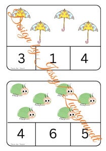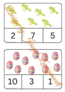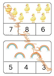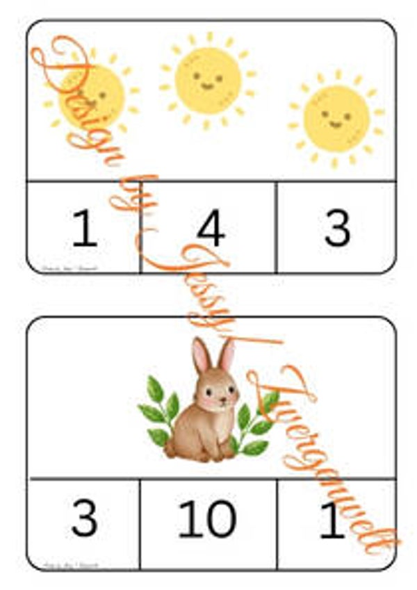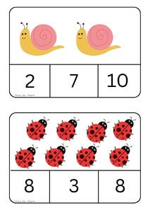 Jede Karte zeigt niedliche Frühlingsmotive wie Sonnen, Hasen, Ostereier, Schmetterlinge, Bienen, Marienkäfer, Tulpen, Regenbögen, Gießkannen und viele mehr. Die Kinder zählen einfach die Bilder und finden die richtige Zahl darunter.