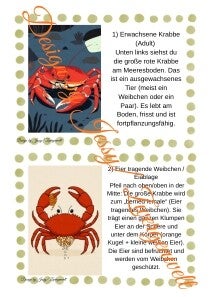 Vom großen roten Krebs am Meeresboden über das Eier tragende Weibchen, die winzigen planktonischen Zoea-Larven bis zur kleinen Megalopa-Krabbe, die zum Boden sinkt und durch viele Häutungen zur erwachsenen Krabbe wird: Das Heft zeigt kindgerecht den kompletten Lebenskreislauf der Krabbe – mit schönen Bildern und Ausmalvorlagen.