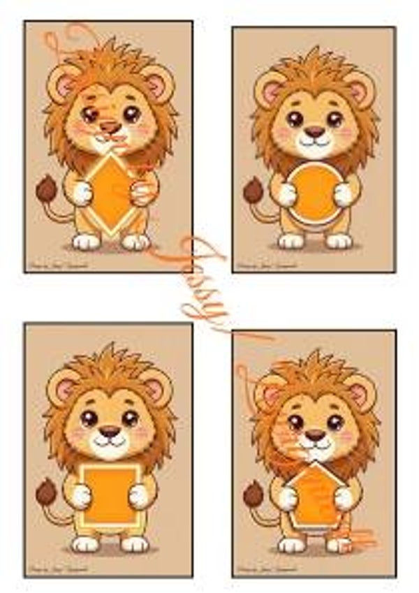 So funktioniert’s: Kinder schauen sich die Karte an, benennen die Form, die der Löwe hält, vergleichen sie mit Gegenständen in der Umgebung oder sortieren die Karten nach Formen. Perfekt zum freien Spiel, für Partnerarbeit oder als kleine Memory-Variante. So werden visuelle Wahrnehmung, räumliches Denken und Konzentration ganz nebenbei gefördert – ohne Druck, nur mit Spaß!