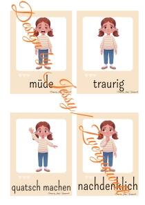 Jede Karte zeigt das Mädchen in einer typischen Körperhaltung und Mimik, sodass Kinder die Emotion sofort erkennen und nachfühlen können. Die klaren, kindgerechten Begriffe machen es leicht, über Gefühle zu sprechen – ideal für Zuhause, Kita, Grundschule oder in der therapeutischen Arbeit.