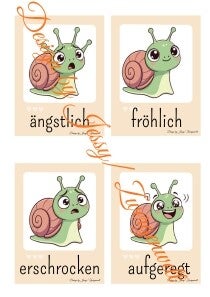 Jede Karte zeigt die Schnecke in einer typischen Körperhaltung und Mimik, sodass Kinder die Emotion sofort erkennen und nachfühlen können. Die klaren, kindgerechten Begriffe machen es leicht, über Gefühle zu sprechen – ideal für Zuhause, Kita, Grundschule oder in der therapeutischen Arbeit.